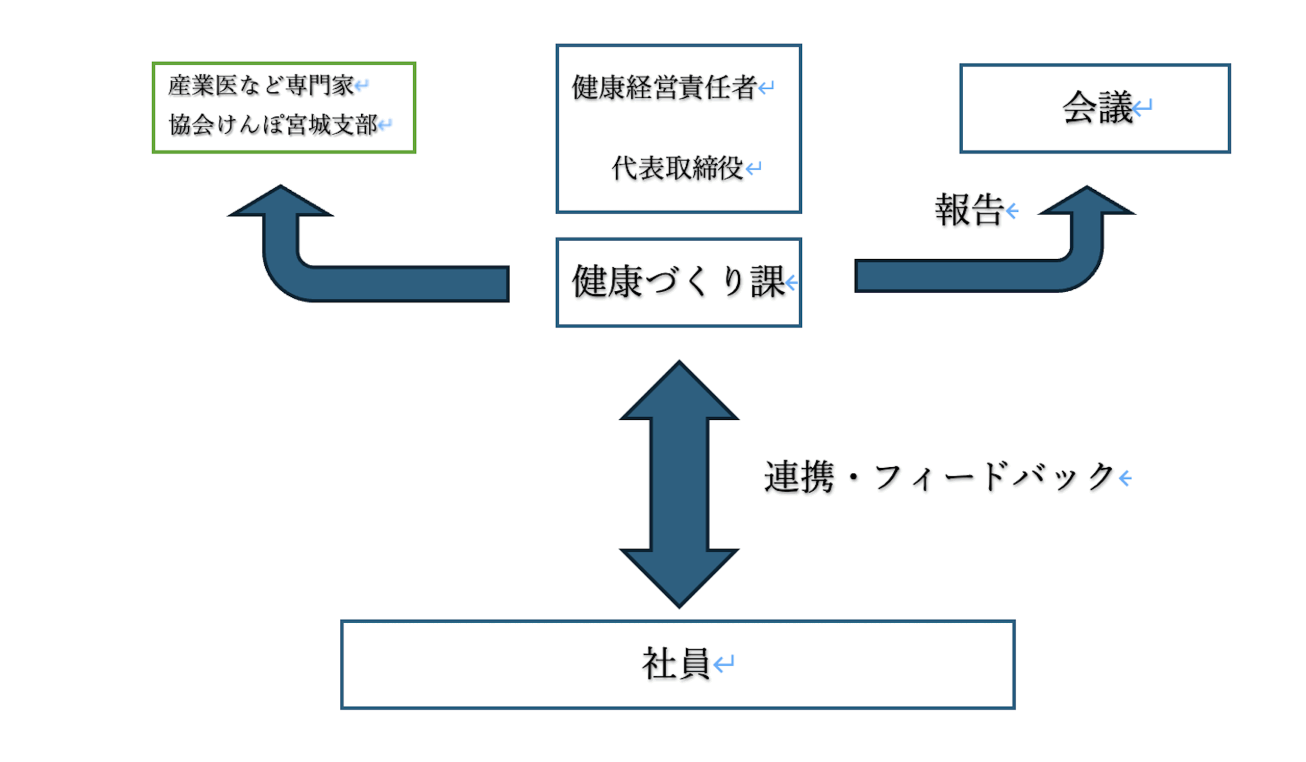 健康経営責任者を代表取締役とする推進体制を構築し産業医、協会けんぽなどと連携を図りながら、健康づくり課と相談しながら方針や施策を展開し、健康経営に取り組んでいます。